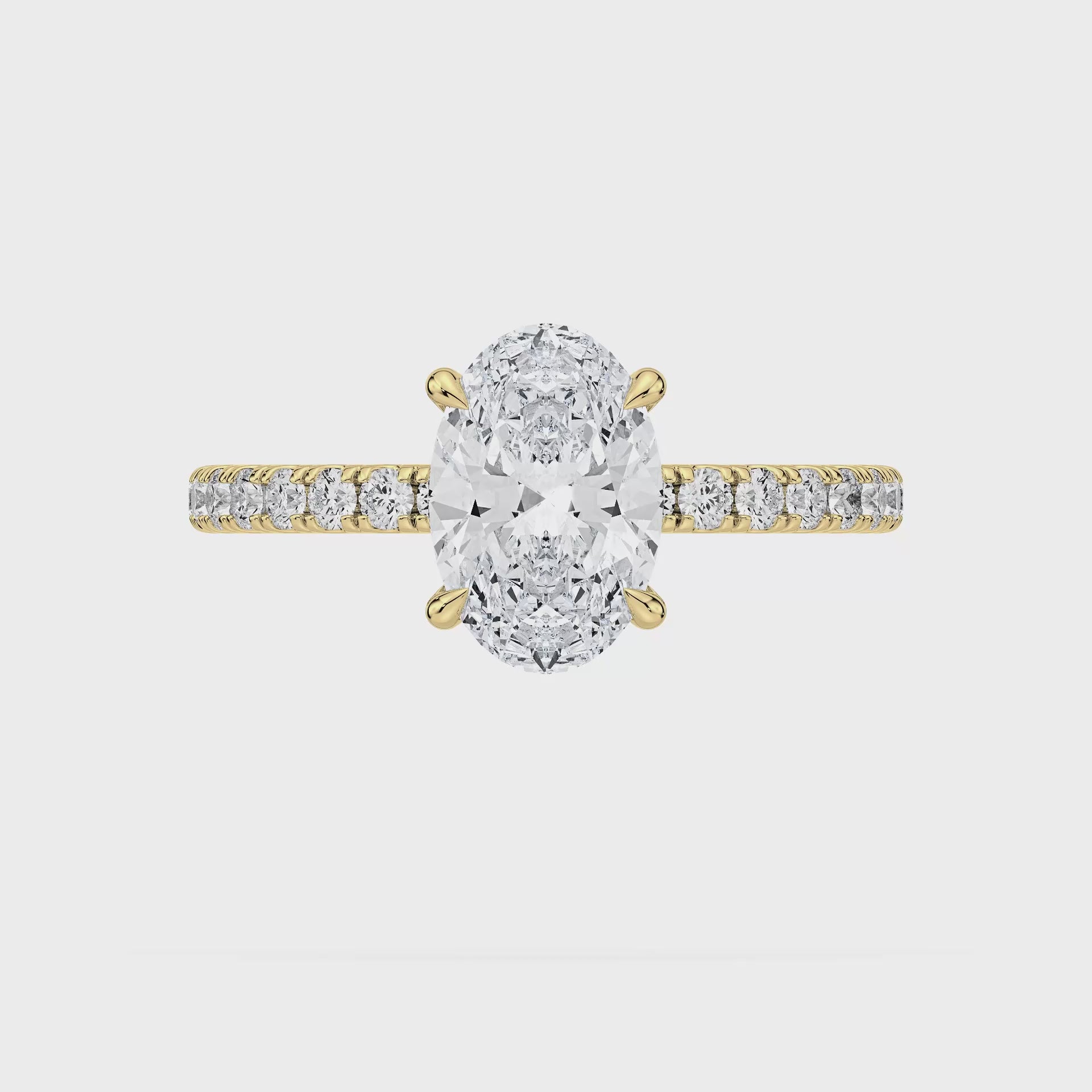 4-CLAW SOLITAIRE OVAL DIAMOND ENGAGEMENT RING WITH SMALL ROUND SHOULDER DIAMONDS AND HIDDEN HALO in 18ct Yellow Gold