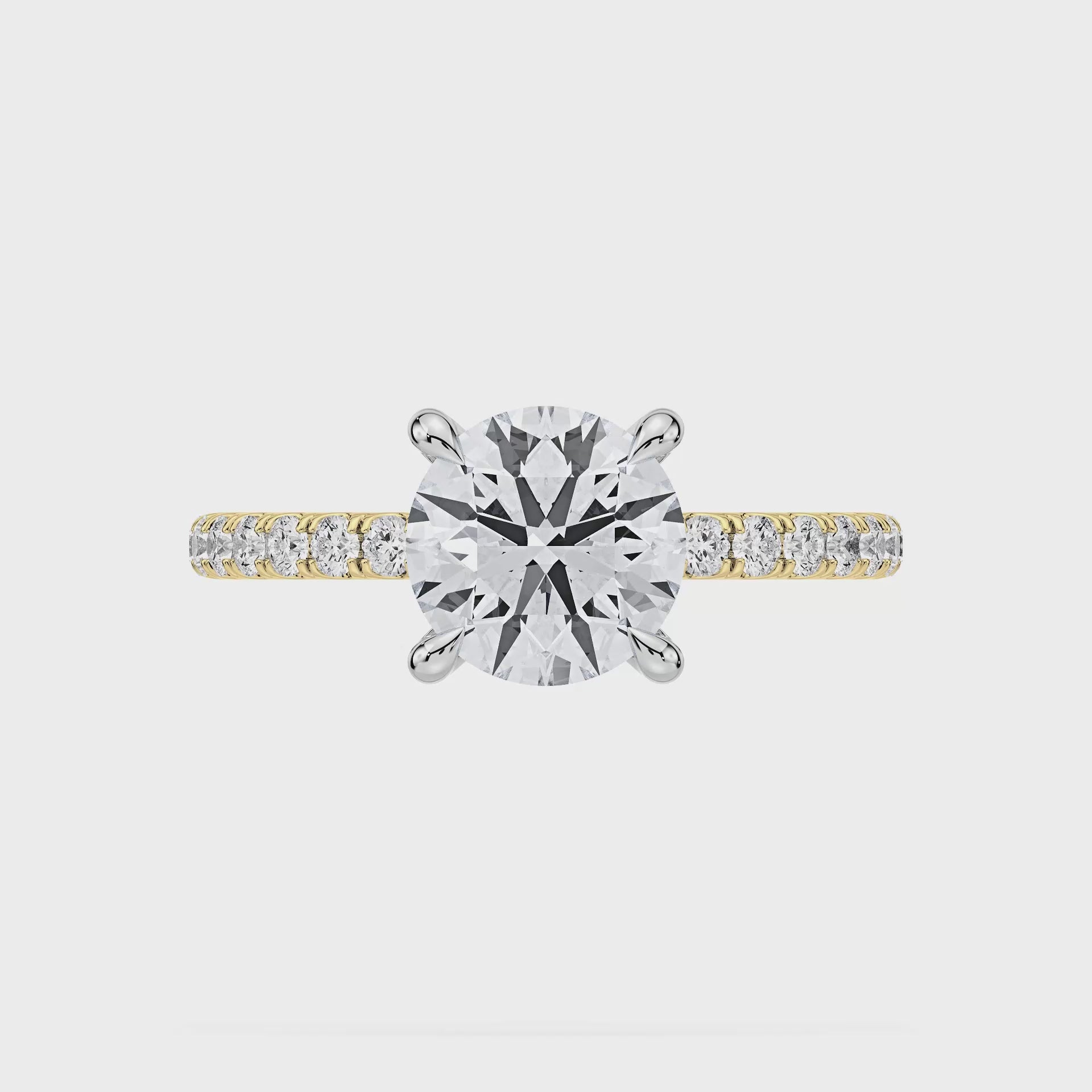 Two Tone GoldA classic diamond engagement ring featuring a Round centre stone held in place by four elegant v-shaped claws and containing small round diamonds set halfway around the band. The ring has a rounded band for comfort.