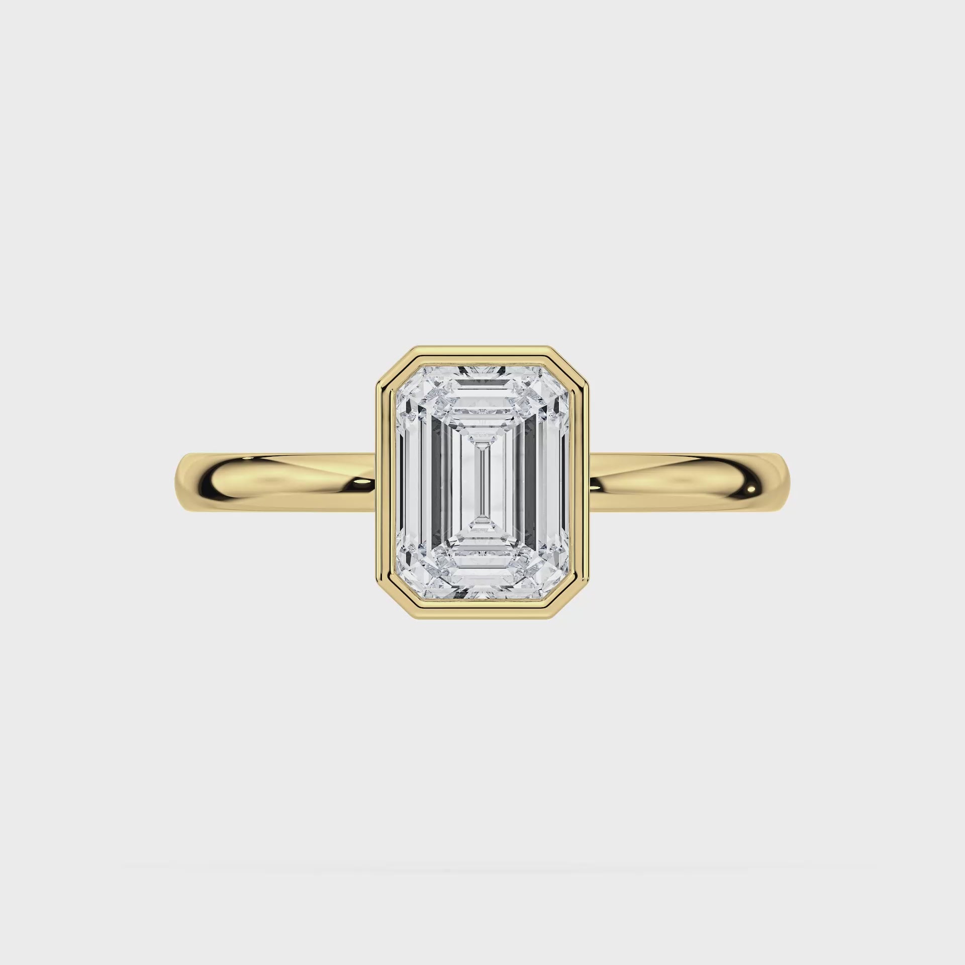 18ct Yellow GoldA classic diamond engagement ring featuring an emerald cut centre stone held in place by a magnificent bezel. The ring is refined, simple and timeless in design and has a rounded band for comfort.